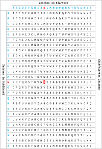 Diese Tabelle ist ein Hilfsmittel zur schnelleren Verschlüsselung. Sie müssen nicht mehr die Positionen im Alphabet ermitteln bzw. berechnen. Stattdessen können Sie den Chiffre-Buchstaben direkt ablesen.