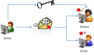 In diesem Beispiel schickt Anna (Absender) eine wichtige Nachricht an Ernst und Emma (Empfänger). Das eMail-Programm von Anna und Emma verfügt über die notwendigen Funktionen um eMails zu signieren bzw. eine Signatur zu verifizieren.