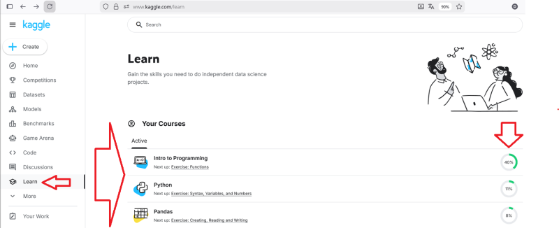 - Nach Ablauf der Zeit, sprich in der nächst möglichen Unterrichtslektion, überprüft die Lehrperson den Bearbeitungsstatus des jeweiligen Werkshops durch die Fortschrittsanzeige in Kaggle-Learning-Bereich.