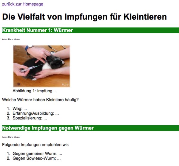 Ein Kunde gibt Ihnen einen statischen, webbasierten Auftritt in Auftrag. Mit dem neuen Webauftritt möchte er Artikel/Tipps zur Kleintierhaltung über dem Internet-Kanal veröffentlichen. Sie schlagen dem Kunden die bewährte Verzeichnisstruktur-01 (zur Zeit nur mit drei Themen-Gruppen) aus Ihrem Lehrbetrieb vor. Der reine Inhalt zu den Artikeln liefert Ihnen der Kunden. Diese Inhalte müssen ein wenig gestyled werden. Die Details dazu folgen in der Aufgabenstellung.