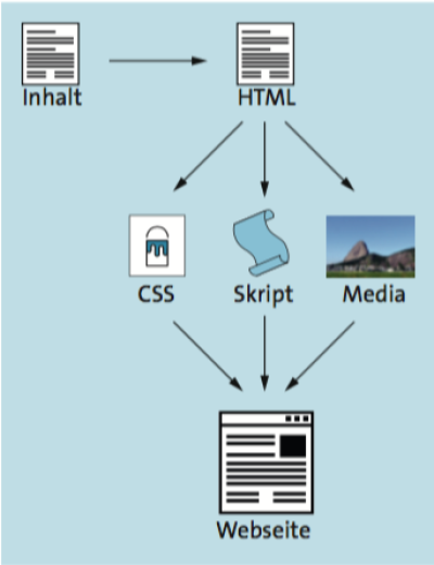 Um eine Webseite aufzubereiten, werden HTML, Mediadateien (Bilder oder Videos), Skripte (z.B. JavaScript, PHP) und CSS (Stylen/Layouten/Animationen) verwendet. Alle diese Basistechnologien zusammen erlauben es moderne Webseiten im Webbrowser darzustellen.