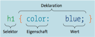 Nachfolgend wird nur der allgemeine Aufbau der CSS-Regel dargelegt. Die unterschiedlichen Typen von Selektoren werden separat behandelt. Eine CSS-Regel setzt sich aus einem Selektor und einer Deklaration zusammen: