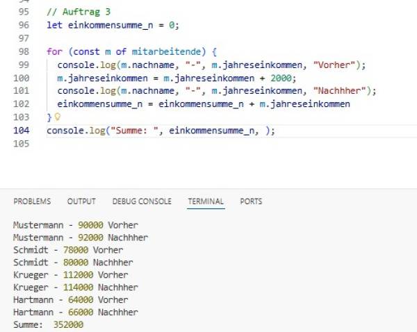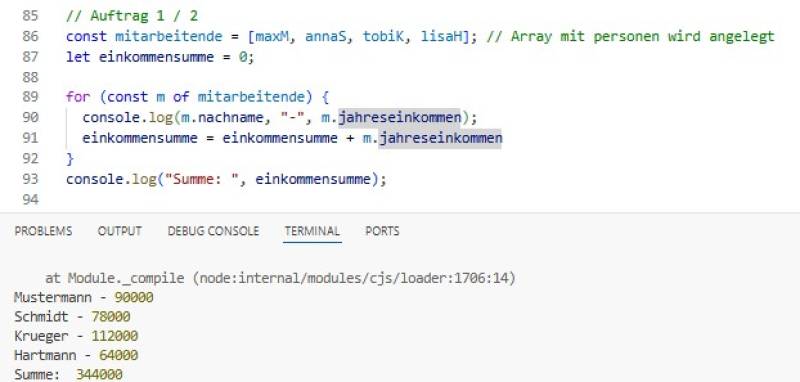 - Summieren Sie die Einkommen aller Mitarbeitenden nach der Schleife und geben Sie diese aus