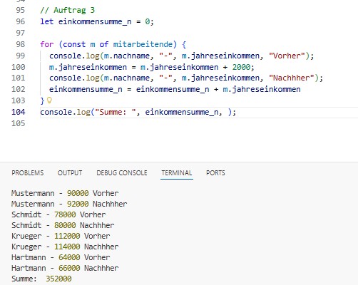 • Summieren Sie die Einkommen aller Mitarbeitenden nach der Schleife und geben Sie diese aus