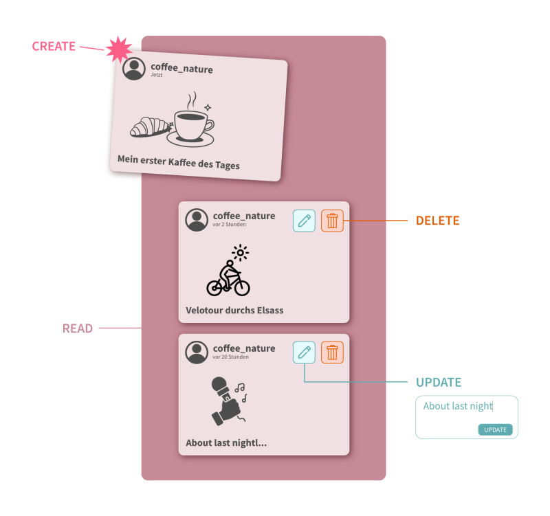Beispiel: CRUD im Social-Media-Feed – User coffee_nature sieht seine Beiträge im Feed (Read), erstellt einen neuen Post (Create), löscht einen bestehenden Beitrag (Delete) und bearbeitet einen Titel (Update).