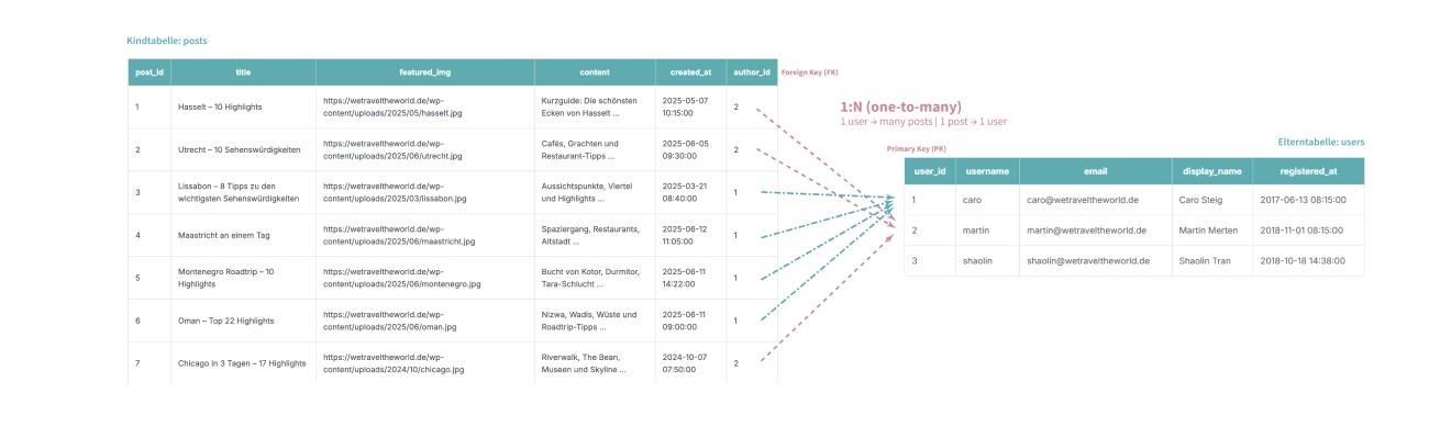 Bezogen auf unser Reiseblog-Beispiel: posts.author_id verweist auf users.user_id.